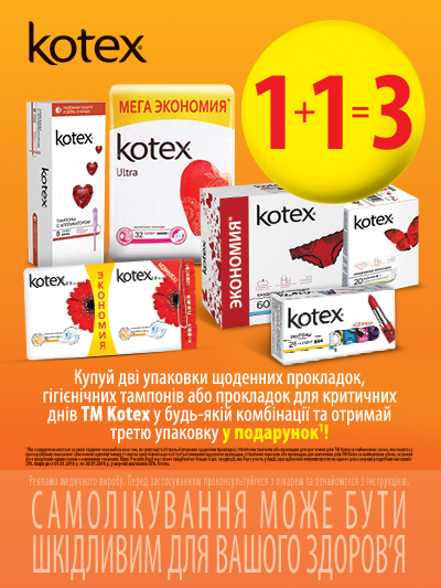 1+1=3! Купуй дві упаковки щоденних прокладок, гігієнічних тампонів або прокладок для критичних днів ТМ Kotex у будь–якій комбінації та отримай третю упаковку у подарунок. ![]() | ||||||