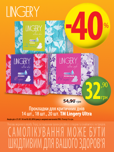 Вигідна ціна — 32,90 грн! Економія 40% на прокладки для критичних днів 14 шт., 18 шт., 20 шт. ТМ Lingery Ultra.
