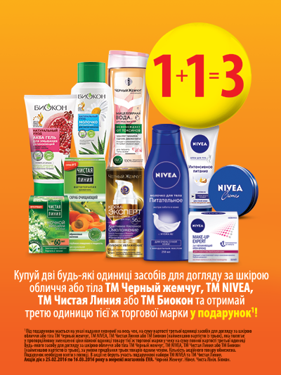 Описание акции: | Купуй дві будь-які одиниці засобів для догляду за шкірою обличчя або тіла ТМ Черный Жемчуг, ТМ Nivea, ТМ Чистая Линия, ТМ Биокон та отримай третю одиницю тієї ж торгової марки у подарунок!![]() | ||||||