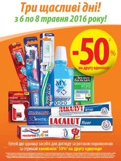 Описание акции: | 1 Економія надається на засоби для догляду за ротовою порожниною меншої вартості, за умови купівлі двох одиниць одним чеком. 2 Інформацію про співвідношення розміру економії до попередньої ціни реалізації товару дізнавайтесь в мережі магазинів EVA. Товар, наявний для продажу, може відрізнятися від зображеного на рекламних матеріалах. Акційна пропозиція не поширюється на товари, які беруть участь в акціях економії, в акціях зі зниженням ціни або в акціях з отриманням подарунку за покупку, зазначених в ціновому каталозі «EVA», що діє з 21.04.2016 по 11.05.2016. В акції не беруть участь зубна щітка ТМ MAY dent дорожня та зубна паста ТМ MAY dent 18 мл. Кількість акційного товару обмежена. Акція діє з 06.05.2016 по 08.05.2016 року в мережі магазинів EVA. Подробиці на www.eva.dp.ua та за телефоном Гарячої лінії 0 800 303 700 (всі дзвінки зі стаціонарних номерів на території України є безкоштовними). Мей дент. ![]() | ||||||