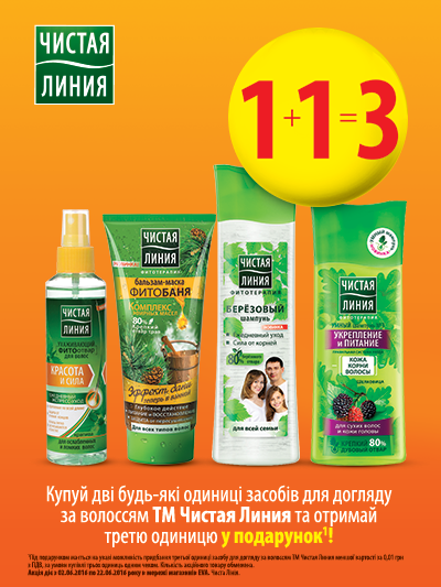 Описание акции: | Як зберегти здоров’я фарбованого волосся Після перевтілень наше волосся потребує особливого догляду, адже його структура стає пористою та ламкою. Для того, щоб не перетворити свої локони на суху та посічену копну, використовуйте спеціальні засоби для фарбованого волосся: креми, бальзами, маски, олійки. Особливу увагу звертайте на якість косметики: в ній має бути якомога більше натуральних зволожуючих компонентів. Косметика «Чистая линия» створена на відварі цілющих трав, котрі інтенсивно відновлюють та захищають наше волосся. Скористайтесь вигідними пропозиціями від EVA! 1+1=3! Купуй дві будь-які одиниці засобів для догляду за волоссям ТМ Чистая линия та отримай третю одиницю у подарунок! Чиста лінія. Акція діє в мережі магазинів EVA з 02.06.2016 по 22.06.2016. ![]() | ||||||