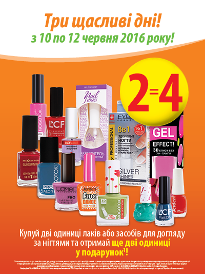 Описание акции: | 1 Економія надається на два лаки або засоби для догляду за нігтями, меншої вартості за 0,01 грн з ПДВ кожний, за умови купівлі чотирьох одиниць одним чеком. Інформацію про співвідношення розміру економії до попередньої ціни реалізації товару дізнавайтесь в мережі магазинів EVA. Товар, наявний для продажу, може відрізнятися від зображеного на рекламних матеріалах. Акційна пропозиція не поширюється на товари, які беруть участь в акціях економії, в акціях зі зниженням ціни або в акціях з отриманням подарунку за покупку, зазначених в ціновому каталозі «EVA». Кількість акційного товару обмежена. ![]() | ||||||