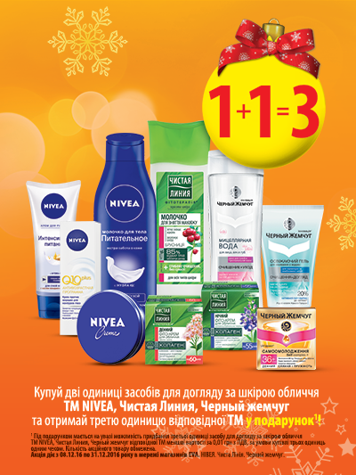 | Описание акции: | ![]() Чому варто обирати косметику однієї марки? Косметологи впевнені, що домогтися оптимального ефекту в догляді за шкірою обличчя можливо тільки в тому випадку, якщо користуватися засобами для очищення, тонізування та зволоження однієї торгової марки. Це пояснюється тим, що компоненти, котрі входять до складу певної серії косметики, однотипні. Вони покликані надавати на шкіру комплексний вплив, і тому результат від застосування таких засобів значно більш суттєвий. 1+1=3! Купуй дві одиниці засобів для догляду за шкірою ТМ Nivea, Черный Жемчуг, Чистая Линия та отримай третю одиницю відповідної ТМ у подарунок! | ||||||