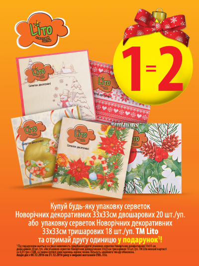 | Описание акции: | Створення святкової атмосфери в інтер'єрі Традиція прикрашати будинок до нового року має в нашій країні не таку тривалу історію, як може здатися. Перші різдвяні прикраси на фасадах будівель стали з'являтися тільки в ХVIII столітті, а всередину приміщення ялинки потрапили взагалі в середині ХIХ століття. А от такі дрібнички, як новорічні серветки, ми використовуємо зовсім недавно, але вони вже стали невід'ємною частиною свята. Погодьтеся: красиво сервований стіл завжди додає святкової атмосфери. А для того, щоб такі прикраси не навантажували ваш сімейний бюджет, скористайтеся вигідною пропозицією від EVA! 1=2! Купуй будь-яку упаковку серветок новорічних декоративних 33х33 см двошарових 20 шт./уп. або упаковку серветок новорічних декоративних 33х33 см тришарових 18 шт./уп. ТМ Lito та отримай другу одиницю у подарунок! ![]() | ||||||