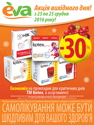 | Описание акции: | Три щасливі дні! 1 Інформацію про співвідношення розміру економії до попередньої ціни реалізації товару дізнавайтесь в мережі магазинів EVA. Товар, наявний для продажу, може відрізнятися від зображеного на рекламних матеріалах. Кількість акційного товару обмежена. Акція діє з 23.12.2016 по 25.12.2016 року в мережі магазинів EVA. Подробиці на сайті www.eva.ua та за телефоном Гарячої лінії 0 800 303 700 (всі дзвінки зі стаціонарних та мобільних телефонів на території України є безкоштовними). ![]() | ||||||
