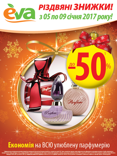 | Описание акции: | ![]() Різдвяні ЗНИЖКИ! 1) Інформацію про співвідношення розміру економії до попередньої ціни реалізації товару дізнавайтесь в мережі магазинів EVA. Товар, наявний для продажу, може відрізнятися від зображеного на рекламних матеріалах. Акційна пропозиція не поширюється на товари, які беруть участь в акціях економії, в акціях зі зниженням ціни або в акціях з отриманням подарунку за покупку, зазначених в ціновому каталозі «EVA», що діє з 01.01.2017 р. по 18.01.2017 р. Кількість акційного товару обмежена. Акція діє з 05.01.2017 р. по 09.01.2017 р. в мережі магазинів EVA. Подробиці на www.eva.ua та за телефоном Гарячої лінії 0 800 303 700 (всі дзвінки зі стаціонарних та мобільних телефонів на території України є безкоштовними). | ||||||