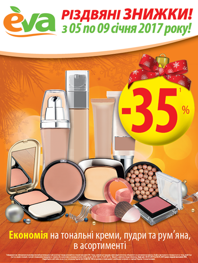 | Описание акции: | ![]() Різдвяні ЗНИЖКИ! 1) Інформацію про співвідношення розміру економії до попередньої ціни реалізації товару дізнавайтесь в мережі магазинів EVA. Товар, наявний для продажу, може відрізнятися від зображеного на рекламних матеріалах. Акційна пропозиція не поширюється на товари, які беруть участь в акціях економії, в акціях зі зниженням ціни або в акціях з отриманням подарунку за покупку, зазначених в ціновому каталозі «EVA», що діє з 01.01.2017 р. по 18.01.2017 р. Кількість акційного товару обмежена. Акція діє з 05.01.2017 р. по 09.01.2017 р. в мережі магазинів EVA. Подробиці на www.eva.ua та за телефоном Гарячої лінії 0 800 303 700 (всі дзвінки зі стаціонарних та мобільних телефонів на території України є безкоштовними). | ||||||