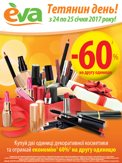 | Описание акции: | ![]() Акція "Тетянин день"! 1 Економія надається на одиницю декоративної косметики меншої вартості, за умови купівлі двох одиниць одним чеком. Акційна пропозиція не поширюється на аксесуари, на товар, який бере участь в акціях економії, в акціях зі зниженням ціни або в акціях з отриманням подарунку за покупку, зазначених в ціновому каталозі «EVA», що діє з 19.01.2017 по 01.02.2017 року. 2 Інформацію про співвідношення розміру економії до попередньої ціни реалізації товару дізнавайтесь в мережі магазинів EVA. Товар, наявний для продажу, може відрізнятися від зображеного на рекламних матеріалах. Кількість акційного товару обмежена. | ||||||