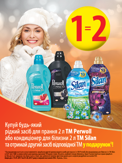 | Описание акции: | Як продовжити життя улюбленого светра? Щоб ваш улюблений светр прослужив вам довше, прати його необхідно вручну або при делікатному режимі в пральній машині. Не всі знають, що вовняні волокна більш чутливі до зовнішнього впливу, порівняно з синтетичними, тому краще скористатися засобом для прання, спеціально створеним для в'язаних виробів. Вони ефективно видаляють забруднення і не псують речі. А в контейнер для ополіскувача додайте спеціальний засіб для полоскання, і ваш улюблений светрик ще довго радуватиме вас ніжністю та свіжістю! 1=2! Купуй будь-який рідкий засіб для прання 2 л ТМ Perwoll або кондиціонер для білизни 2 л TM Silan та отримай другий засіб відповідної ТМ у подарунок! ![]() | ||||||