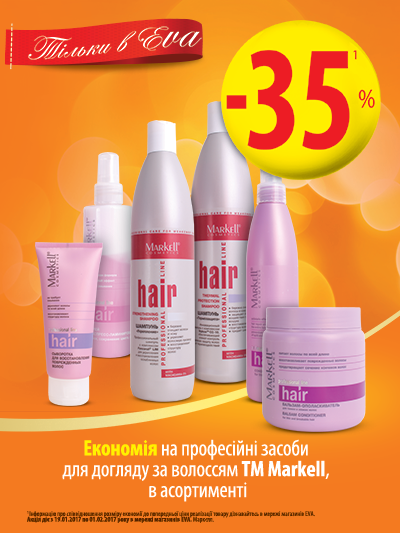 | Описание акции: | Як відновити волосся після укладання? Зимові свята — одне з найсуворіших випробувань для нашого волосся. Вирушаючи в гості до друзів або в ресторан, напевно ви робили не одну стильну укладку. Після того, як свята залишилися позаду, волосся часто стає тьмяним і млявим через те, що на нього була нанесена велика кількість засобів для укладання за останній час. Відновити його природний блиск і сяйво допоможуть професійні засоби для догляду за волоссям. Скористайтеся вигідними пропозиціями від EVA! Економія 35% на професійні засоби для догляду за волоссям ТМ Markell в асортименті. ![]() | ||||||