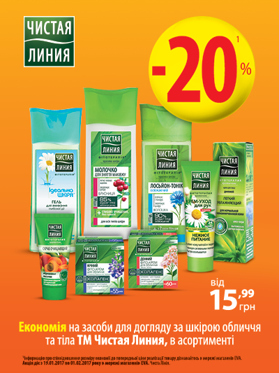 | Описание акции: | Чи потрібно купувати для зими спеціальні креми? Часто дівчат турбує питання, чи є необхідність в придбанні якогось спеціального «зимового» крему? Якщо говорити про засоби, призначені для забезпечення додаткового захисту від холоду, то вони дійсно потрібні не всім, а тільки тим, хто проводить багато часу на вулиці. А якщо ви не перебуваєте на морозі так довго, вам буде достатньо поживного крему вранці і зволожуючого засобу ввечері. На відміну від «літніх» кремів, вони повинні бути більш жирними. Вигідна ціна — від 15,99 грн, на засоби для догляду за шкірою обличчя та тіла ТМ Чистая Линия в асортименті. Економія 20%! ![]() | ||||||