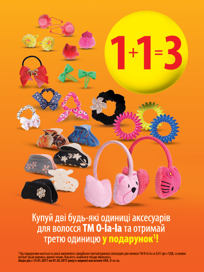 | Описание акции: | Оригінальна зачіска на кожен день Ось уже кілька сезонів актуальною залишається тенденція плетіння косичок. Надзвичайно красиво виглядає французький «колосок», що проходить змійкою по голові, а також зачіски, що складаються з декількох кіс. Завершальним штрихом стане елегантна трояндочка, зроблена з коси, викладеної по колу. Закріпити результат вам допоможуть аксесуари для волосся. Скористайтеся вигідною пропозицією від мережі магазинів EVA та придбайте аксесуари для улюбленої зачіски! 1+1=3! Купуй дві будь-які одиниці аксесуарів для волосся ТМ O-la-la та отримай третю одиницю у подарунок! ![]() | ||||||
