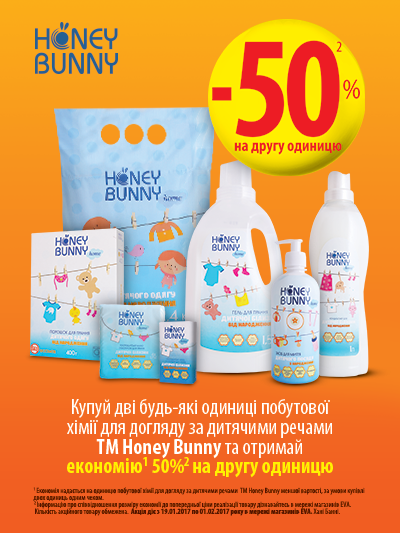 | Описание акции: | Чому дітям — тільки дитячі засоби? На відміну від «дорослих» засобів, дитяча побутова хімія розробляється на основі поверхнево-активних речовин, які не завдають шкоди здоров'ю малюка. Вони ефективно борються з забрудненням, при цьому не залишаючись на тканині та не викликаючи алергії навіть у найбільш чутливих до хімічних речовин малюків. Використовувати їх можна навіть при догляді за речами новонароджених. Не забудьте зазирнути до EVA, щоб вигідно придбати якісні засоби для догляду за дитячими речами! Економія 50% на другу одиницю! Купуй дві будь-які одиниці побутової хімії для догляду за дитячими речами ТМ Honey Bunny та отримай економію 50% на другу одиницю! ![]() | ||||||