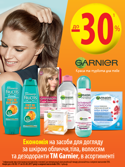 | Описание акции: | ![]() Все для твоєї краси! Незабаром настане найромантичніший день року — День святого Валентина, тож можна м’яко натякнути коханому про те, чого би вам хотілося отримати в якості подарунка до свята ;) В лінії магазинів EVA можна придбати якісні товари для краси, здоров’я та оселі за привабливими цінами. Не забудьте також купити приємні подаруночки для своїх рідних, подруг та близьких — акційні знижки від EVA дозволять зекономити ваш бюджет напередодні свята! Краса та турбота для тебе! Економія до 30% на засоби для догляду за шкірою обличчя, тіла, волоссям та дезодоранти TM Garnier в асортименті. | ||||||