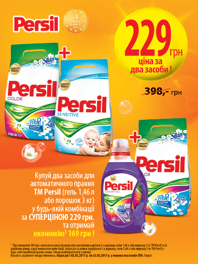 | Описание акции: | ![]() Ідеальне прання Як видалити плями від лаку для нігтів з улюбленого одягу? Чим швидше ви помітите пляму, тим більше шансів врятувати річ! Спочатку за допомогою ватного тампона нанесіть на пляму трохи рідини для зняття лаку. Не тріть її, а злегка промокніть. Бажано попередньо зробити тест на непомітному місці, щоб переконатися, що рідина не зіпсує тканину. Почекайте кілька хвилин, поки лак пом’якшиться, а потім виперіть річ у звичайний спосіб за допомогою якісного прального засобу. Вигідно завжди! Ціна за два засоби — 229 грн! Купуй два засоби для автоматичного прання TM Persil (гель 1,46 л або порошок 3 кг) у будь-якій комбінації за СУПЕРЦІНОЮ — 229 грн! Економія 169 грн! | ||||||