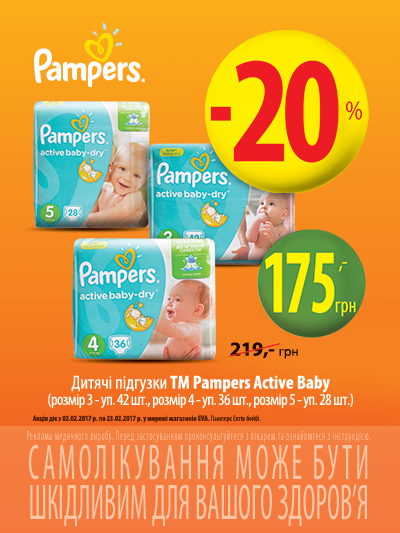 | Описание акции: | Мамам на замітку: 8 кроків до горщика 1. Фізіологічна готовність. Вік: 1,5–2 роки, дитина повинна добре ходити, добре сидіти та тримати спину. 2. Психологічна готовність. 1,5–2 роки — ідеальний час для привчання до горщика. 3. Знайомство з горщиком: він має стояти в полі зору дитини. Дитина має розуміти, що це таке і навіщо воно потрібне. Не поспішайте: малюку знадобиться деякий час, щоб звикнути. 4. Регулярне садіння: зранку, після денного сну тощо. Кожна матуся знає, коли її малюк зазвичай це робить. Краще сидіти на горщику не довше 2–3 хвилин. 5. Оптимально, якщо хлопчика ходити в туалет навчить тато. 6. «Ловимо момент». Протягом дня ви, певно, помічаєте, що ваша дитина якось демонструє бажання сходити в туалет. Це говорить про те, що вона готова сісти на горщик. 7. Обов’язково хваліть дитину, коли у неї все вийшло і в жодному разі не сваріть, якщо щось пішло не так. А після того, як у вас все вийде правильно, можна переходити до 8 кроку: навчання самостійно знімати одяг та сідати на горщик. Вигідна ціна — 175 грн! Економія 20% на дитячі підгузки ТМ Pampers Active Baby (розмір 3 — уп. 42 шт., розмір 4 — 36 шт., розмір 5 — уп. 28 шт.). = | ||||||
