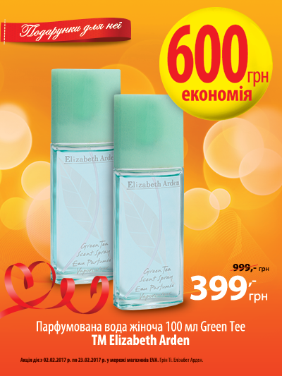 | Описание акции: | ![]() Green Tea — аромат для стильних жінок Аромат Green Tea від Elizabeth Arden — це океан прохолоди та спокою, котрий наповнить кожен ваш день гармонією та ніжністю. В чистих нотах цього аромату виразно відчуваються мотиви зеленого чаю — прозорі та свіжі. Класичне звучання Green Tea починається з дуету лимона та бергамота, котрий відтіняється легкими нотами апельсинової шкірки та ревіня. Далі на сцені з’являються «ноти серця» — амбра, мускус, жасмин, дубовий мох та гвоздика, котрі плавно перетікають в благородний шлейф з зеленого чаю, тмину, гвоздики та щавлю. Green Tea — це чудовий вибір для сучасних жінок, котрі завжди досягають своїх цілей та одночасно вміють бути ніжними та чуттєвими. Вигідно завжди! Економія 600 грн! Купуй жіночу парфумовану воду 100 мл Green Tea TM Elizabeth Arden за акційною ціною — 399 грн! | ||||||