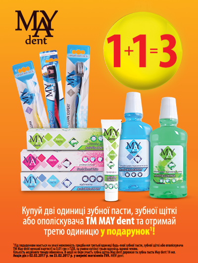 | Описание акции: | ![]() Якою має бути якісна зубна щітка? Хороша зубна щітка чистить не тільки зуби. На зворотному боці голівки є рифлення, яке використовується для чищення язика. Це допомагає запобігти утворенню бактеріального нальоту і неприємного запаху. Крім того, у гарної зубної щітки — гнучка голівка і ручка, зручна для захоплення. Вона має потовщений кінчик з пористого матеріалу, який не ковзає в руках. Рифлені щітки потрібно періодично чистити від слідів зубної пасти. В'ївся наліт — сигнал до якомога скорішої заміни щітки, навіть якщо її термін експлуатації ще не закінчився. 1+1=3! Купуй дві одиниці зубної пасти, зубної щітки або ополіскувача TM May Dent та отримай третю одиницю у подарунок! | ||||||