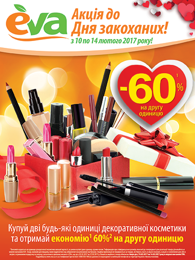 | Описание акции: | Акція до Дня закоханих! 1 Економія надається на одиницю декоративної косметики меншої вартості, за умови купівлі двох одиниць одним чеком. 2 Інформацію про співвідношення розміру економії до попередньої ціни реалізації товару дізнавайтесь в мережі магазинів EVA. Товар, наявний для продажу, може відрізнятися від зображеного на рекламних матеріалах. Акційна пропозиція не поширюється на товари, які беруть участь в акціях економії, в акціях зі зниженням ціни або в акціях з отриманням подарунку за покупку, зазначених в ціновому каталозі «EVA», що діє з 02.02.2017 по 23.02.2017 р. Кількість акційного товару обмежена. Акція діє з 10.02.2017 по 14.02.2017 року в мережі магазинів EVA. ![]() | ||||||