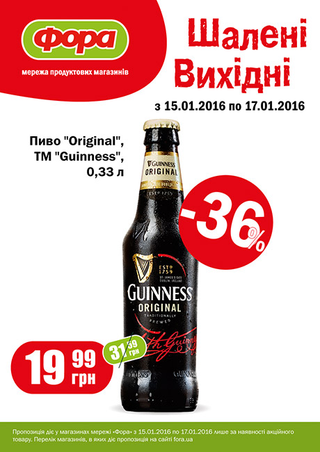 Описание акции: | На пиво Guinness ціна зі знижкою всього 19,99 грн.![]() | ||||||