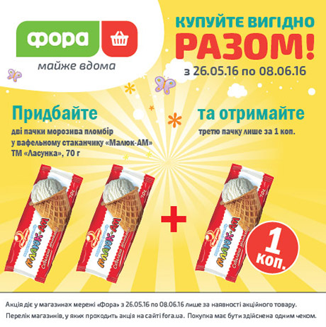 Описание акции: | Морозиво пломбір 1+1=3![]() | ||||||
