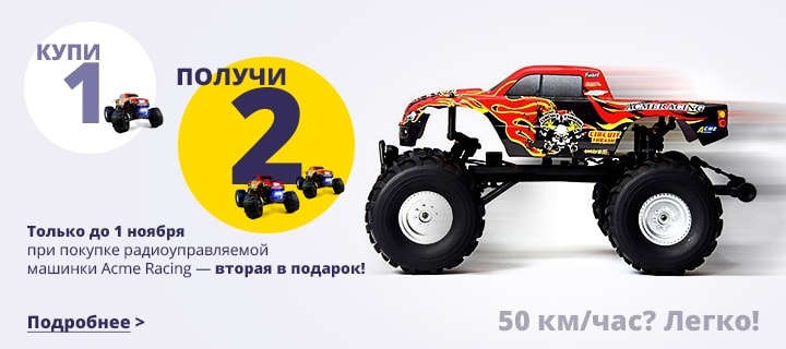 Описание акции: | При покупке радиоуправляемой машинки Acme Racing - вторая в подарок!![]() | |