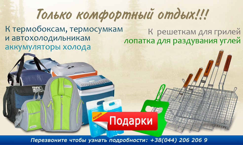 Описание акции: | Только комфортный отдых! Подарки для любителей активного отдыха. Акуумуляторы холода Campingaz Freez`Pack M10 или Campingaz Freez`Pack M20 в подарок к термосумкам, термобаксам и автохолодильникам, а к решеткам для гриля – лопатка для раздувания углей Кемпинг «Пикник». ![]() | ||||||