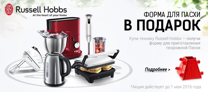 Описание акции: | Купи технику Russell Hobbs — получи форму для приготовления творожной Пасхи в подарок!![]() | ||||||