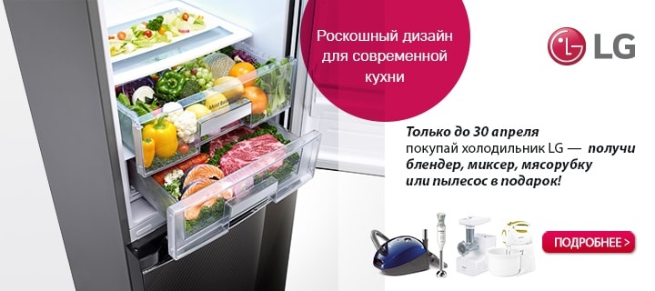Описание акции: | Покупай холодильник LG — получи блендер, миксер, мясорубку или пылесос в подарок!![]() | ||||||