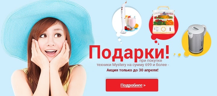 Описание акции: | Покупай технику Mystery на сумму 699 грн и более — получай соковыжималку, блендер, электрочайник или пароварку в подарок!![]() | ||||||
