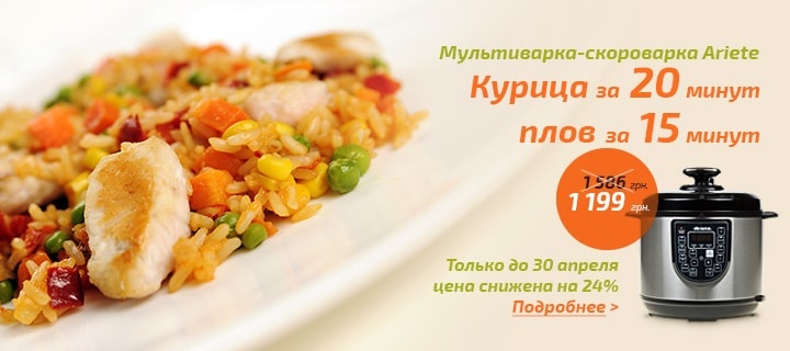 Описание акции: | Только до 30 апреля успей купить мультиварку-скороварку Ariete со скидкой 24%![]() | ||||||