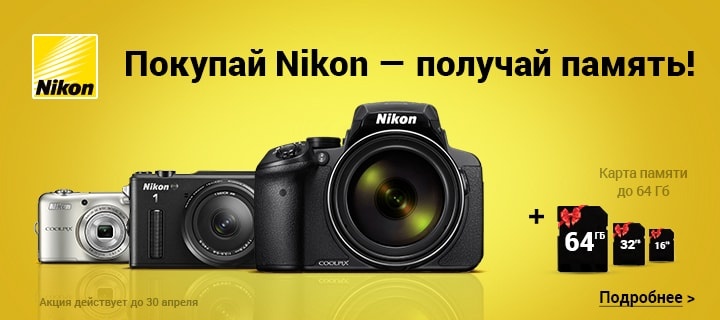 Описание акции: | Купи фотоаппарат Nikon — получи карту памяти до 64 Гб в подарок!![]() | ||||||