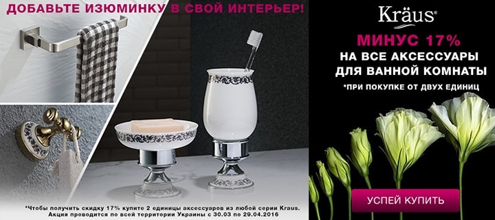 Описание акции: | Скидка 17% на аксессуары для ванной комнаты KRAUS![]() | ||||||