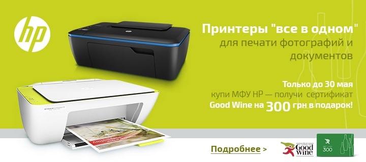 Описание акции: | Купи МФУ HP — получи cертификат Good Wine на 300 грн в подарок!![]() | ||||||