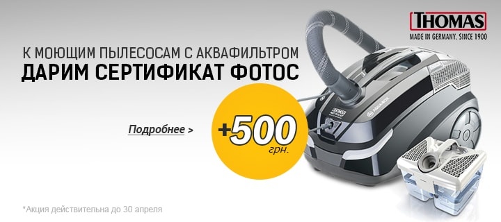 Описание акции: | Купи моющий пылесос Thomas — получи сертификат Fotos до 500 грн в подарок!![]() | ||||||