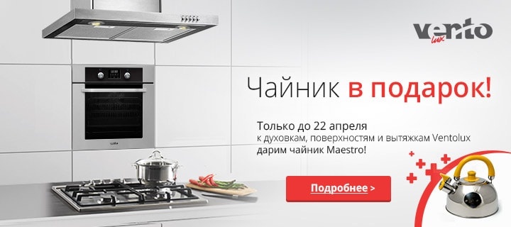 Описание акции: | Купи вытяжку, духовку или поверхность Ventolux — получи чайник в подарок!![]() | ||||||