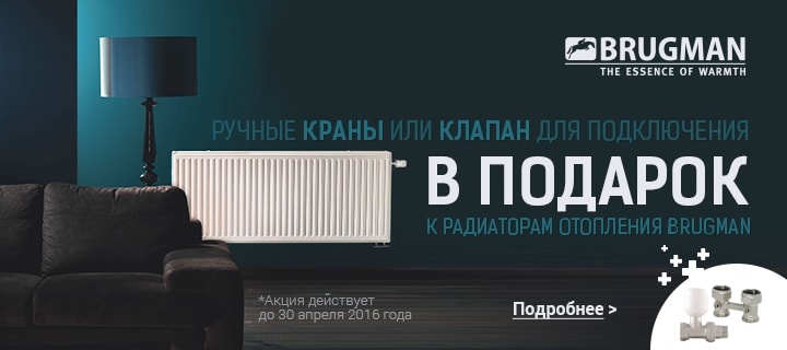 Описание акции: | Купи радиатор отопления Brugman — получи ручные краны или клапан для подключения в подарок!![]() | ||||||