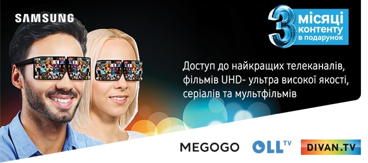 Описание акции: | Купуйте телевізор Samsung Smart TV та отримайте 3 місяці безкоштовного перегляду фільмів та телеканалів у подарунок!![]() | ||||||