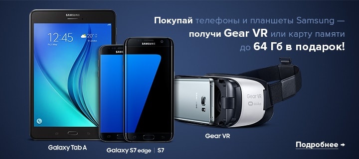 Описание акции: | Покупай телефоны и планшеты Samsung — получи Gear VR или карту памяти до 64 Гб в подарок!![]() | ||||||