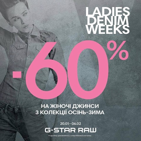| Описание акции: | ![]() -60 % на все женские джинсы из коллекции Осень-Зима! Да, только на женскую коллекцию! Справедливость есть в этом Мире! Акция действует только с 20.01 по 06.02 в магазинах G-Star и online | ||||||