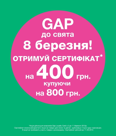 Описание акции: | При покупке вещей из коллекции SS/2012 на 800 грн Вы получите сертификат на 400 грн, который можно использовать при следующей покупке женской одежды и нарядов для маленьких леди (коллекции GapKids и babyGap). Специальное праздничное предложение действует для всех владельцев Gap Loyalty Card до 11 марта. Сертификат можно использовать, выполнив только одну транзакцию. ![]() | ||||||