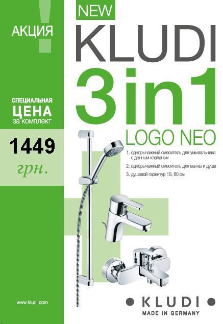 Описание акции: | Акция!!! Набор KLUDI LOGO NEO (НОВИНКА!!!)![]() Уважаемые клиенты! Спешим сообщить Вам, что в продаже появился Акционный набор смесителей для ванной комнаты новой серии Logo Neo (Kludi ГЕРМАНИЯ!) по супер-низкой цене! Набор состоит из следующих позиций: *Смеситель д/умыв. Logo Neo c донным клапаном арт. 372810575; *Смеситель ванна/душ Logo Neo арт. 376810575; *Душевой набор ZENTA 1 S 60 mm арт. 606300500. Цена такого набора - 1449 грн./шт. Спешите, количество наборов ограничено!!! | ||||||