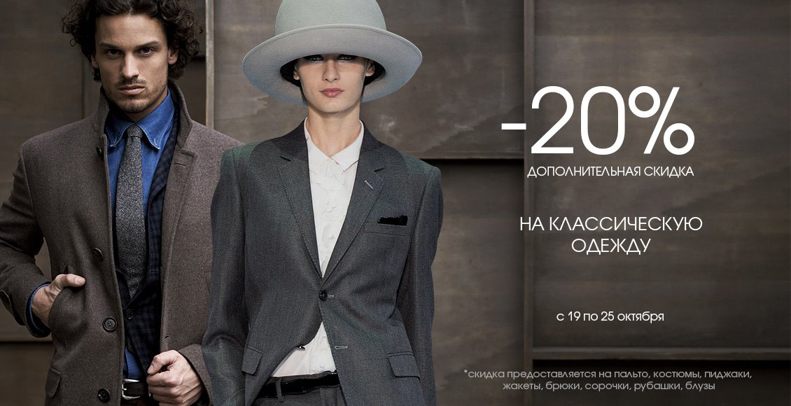 Дополнительная скидка 20% на мужскую и женскую классическую одежду.