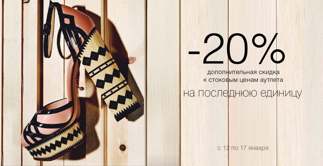 дополнительная скидка 20% на последнюю единицу товара. Акция распространяется на обувь, одежду и аксессуары.
