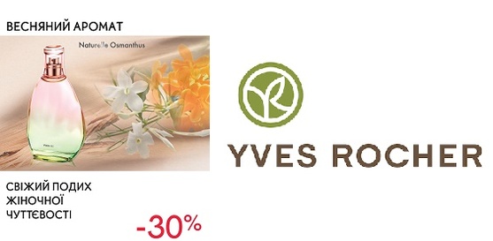 | Описание акции: | Yves Rocher дарує весняні аромати![]() Бутики мережі Yves Rocher дарують знижки -30% на аромати Naturelle Osmanthus, Moment de Bonheur l'Eau і Quelques Notes d’Amour Акція дійсна до 2квітня 2017 року. Детальну інформацію дізнавайтесь у консультантів. | ||||||