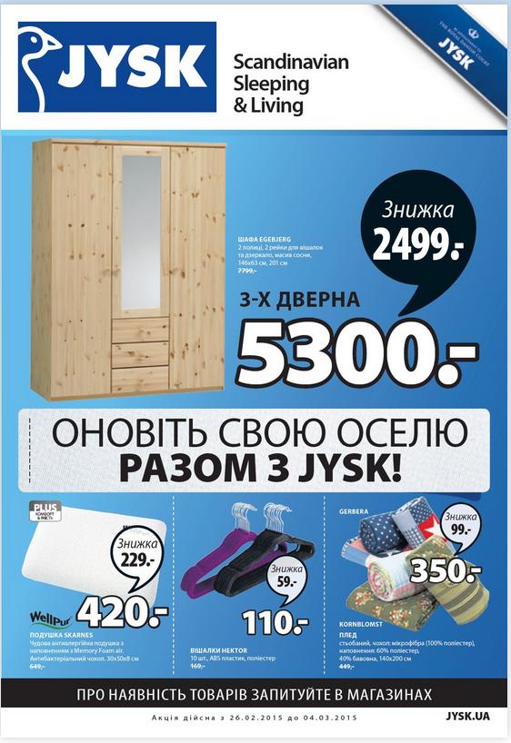 Описание акции: | Найкращі пропозиції та знижки на меблі, матраси, постільну білизну, рушники, домашній текстиль, декор та аксесуари від JYSK з 26.02.2015 по 04.03.2015![]() ![]() ![]() ![]() ![]() | ||||||
