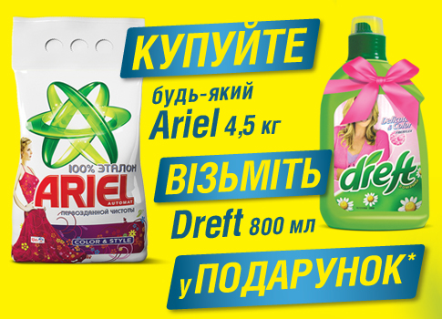 Описание акции: | Спеціальна пропозиція від ТМ Ariel та ТМ Dreft З 30 січня по 26 лютого 2012 року включно запрошуємо Вас завітати до магазинів "КОСМО" по всій Україні, щоб придбати на 1 чек будь-який пральний порошок ТМ Ariel в упаковці 4,5 кг - адже разом із ним Ви зможете взяти з полиці магазину також і чудовий засіб для прання торгової марки Dreft місткістю 800 мл, який коштуватиме Вам лише символічні 5 копійок! ![]() Увага: акція проводиться в усіх магазинах мережі "КОСМО", допоки в них наявний акційний товар. Знижки дисконтних програм "КОСМО" та купонів на даний акційний товар не поширюються. | ||||||