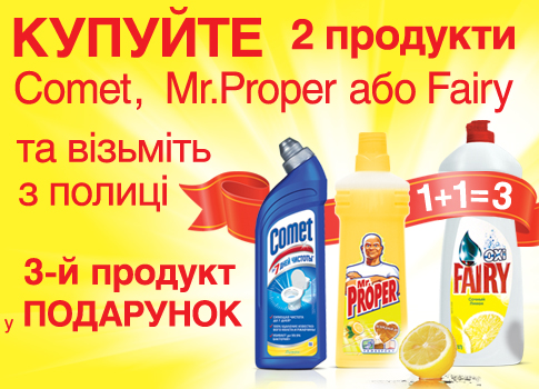 Описание акции: | Акція від ТМ Fairy, Proper, Comet: 1+1=3 З 27 лютого по 25 березня 2012 року включно запрошуємо Вас завітати до магазинів "КОСМО" по всій Україні, щоб придбати на один чек 2 будь-які продукти з-поміж засобів для миття посуду ТМ Fairy (1л), засобів Comet Універсал (750 мл), засобів Comet для чистки туалету (750 мл) та засобів Mr Proper (750 мл). Адже разом із ними Ви зможете взяти з полиці магазину також і третій продукт зі списку, наведено вище, який коштуватиме Вам лише символічні 5 копійок! ![]() Увага: акція проводиться в усіх магазинах мережі "КОСМО", допоки в них наявний акційний товар. Знижки дисконтних програм "КОСМО" та купонів на даний акційний товар не поширюються. | ||||||