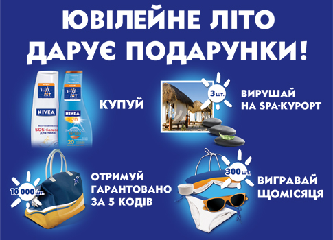 Ювілейне літо: Nivea дарує подарунки! З 1 червня по 31 серпня 2012 року включно поспішайте до магазинів "КОСМО" по всій Україні, щоб купити продукцію ТМ Nivea, позначену спеціальним акційним стікером та взяти участь у розіграші суперпризів: одної з 10 000 фірмових дорожніх сумок (гарантовано за 5 акційних кодів), одного з 300 сертифікатів на суму 300 грн на придбання літніх товарів (щомісяця) або одного з 3-х сертифікатів на подорож на двох до будь-якого СПА-курорту світу на Ваш вибір! Для того щоб взяти участь у розіграші, достатньо надіслати SMS з кодом на короткий номер 9100 або зареєструватися на сайті www.nivea.ua. ![]() | ||||||
