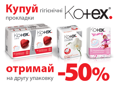 Описание акции: | Гігієнічні прокладки ТМ Kotex зі знижкою 50% З 27 серпня по 30 вересня 2012 року включно запрошуємо Вас завітати до магазинів "КОСМО" у своєму місті, щоб скористатися вигідною пропозицією та придбати упаковку* гігієнічних прокладок торгової марки Kotex - адже в цьому разі Ви отримаєте право придбати на даний чек також і другу аналогічну упаковку прокладок удвічі дешевше від її звичайної роздрібної ціни! В акції бере участь така продукція: KOTEX Extra Soft Colors Super 16 шт. прокладки KOTEX Extra Soft Normal 10 шт. прокладки KOTEX Extra Soft Normal 20 шт. прокладки KOTEX Extra Soft Super 16 шт. прокладки KOTEX Extra Soft Super 8 шт. прокладки KOTEX Ultra Dry&Soft Night 7 шт. прокладки KOTEX Ultra Dry&Soft Normal 20 шт. прокладки KOTEX Ultra Dry&Soft Super 16 шт. прокладки KOTEX Ultra Normal (м'яка) 10 шт. прокладки KOTEX Ultra Normal (м'яка) 20 шт. прокладки KOTEX Ultra Normal (сіточка) 10 шт. прокладки KOTEX Ultra Normal (сіточка) 20 шт. прокладки KOTEX Ultra Super (м'яка) 16 шт. прокладки KOTEX Ultra Super (м'яка) 8 шт. прокладки KOTEX Ultra Super (сіточка) 16 шт. прокладки KOTEX Ultra Super (сіточка) 8 шт. прокладки KOTEX Young Normal з крильцями 10 шт. прокл. ![]() | ||||||